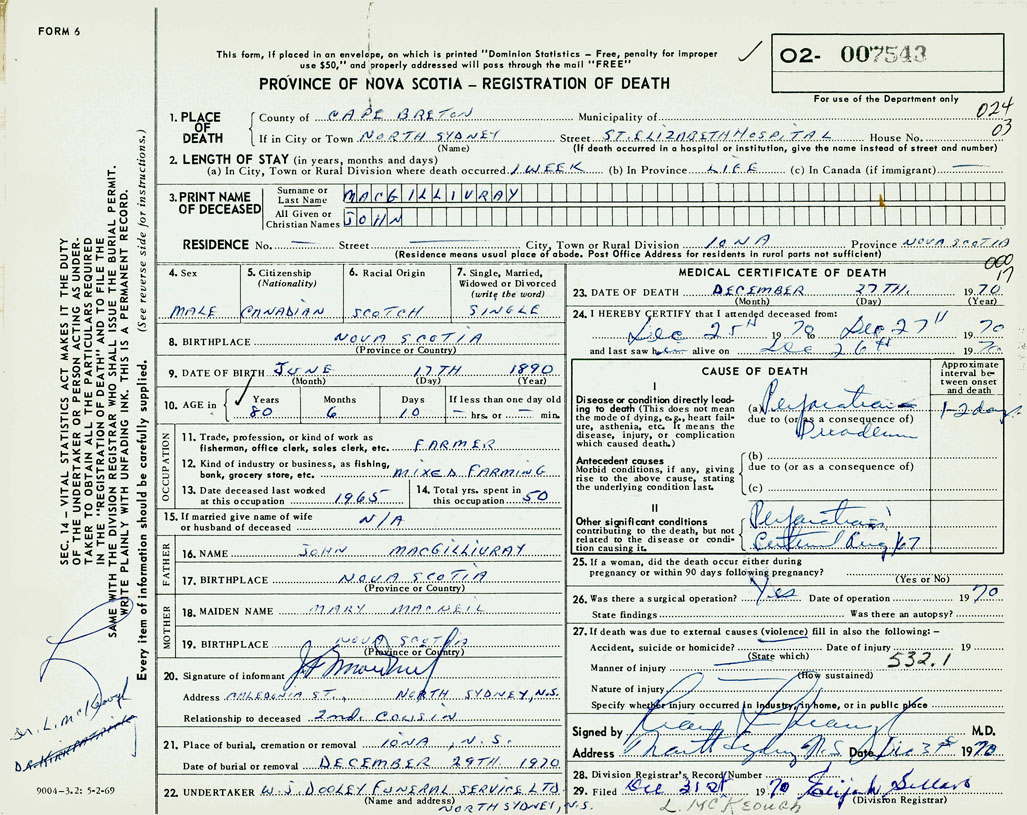 1. PLACE OF DEATH County of Cape Breton If in City or Town North Sydney