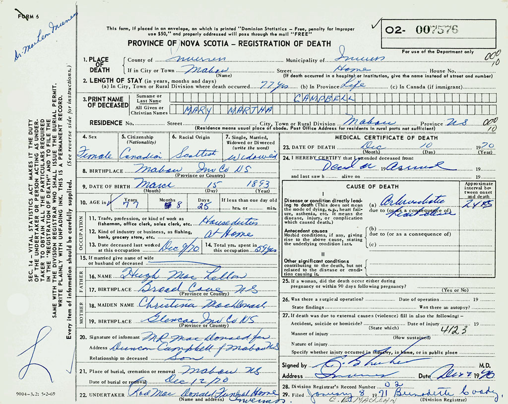 1. PLACE OF DEATH County of Inverness If in City or Town Mabou