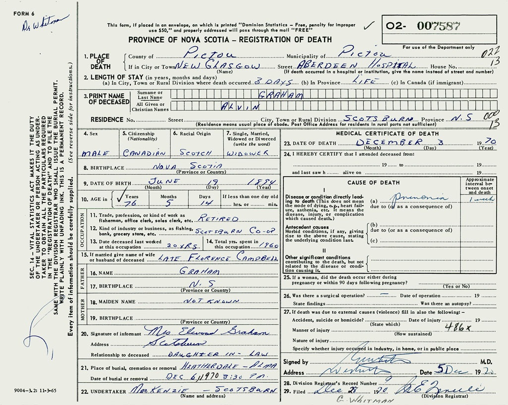 PROVINCE OF NOVA SCOTIA — REGISTRATION OF DEATH