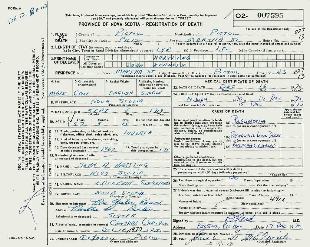 PROVINCE OF NOVA SCOTIA — REGISTRATION OF DEATH