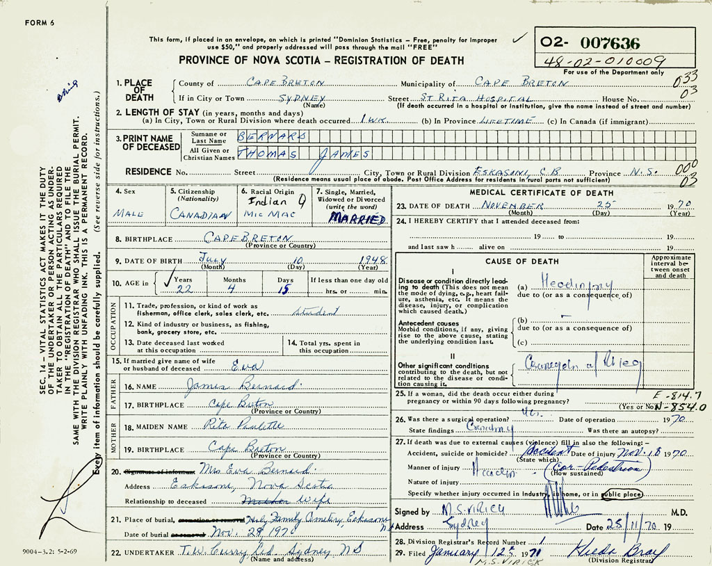 1. PLACE OF DEATH County of Cape Breton If in City or Town Sydney