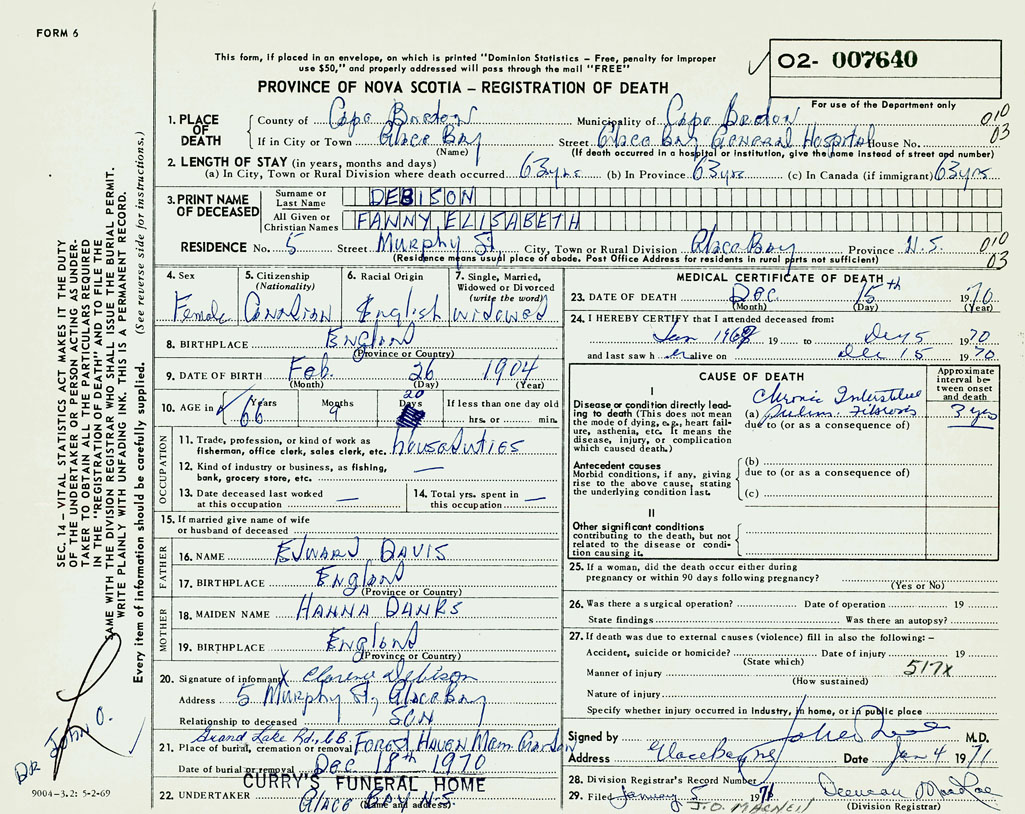 1. PLACE OF DEATH County of Cape Breton If in City or Town Glace Bay