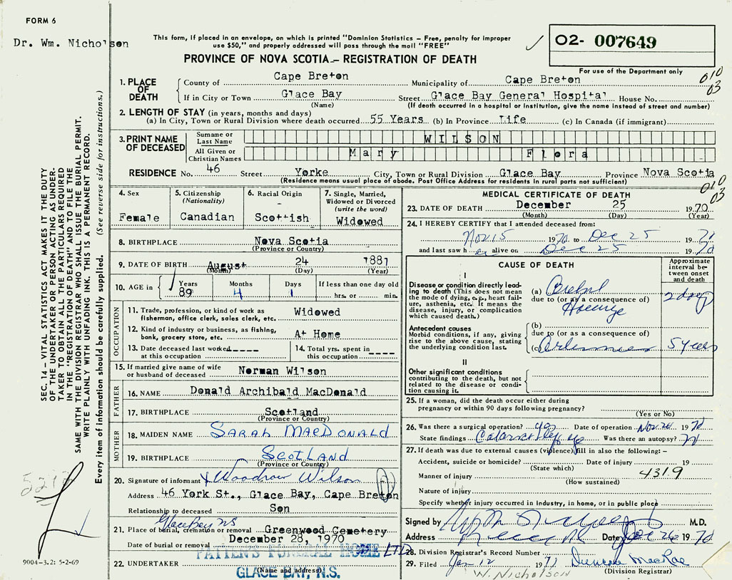 1. PLACE OF DEATH County of Cape Breton If in City or Town Glace Bay