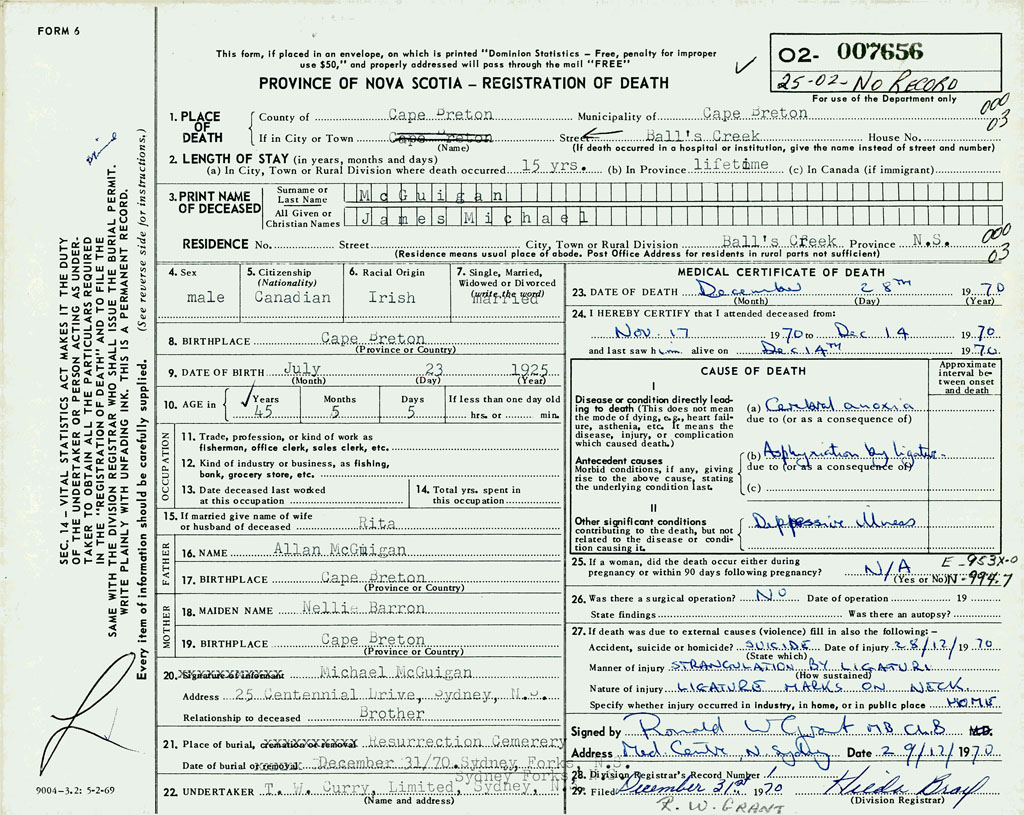 PROVINCE OF NOVA SCOTIA — REGISTRATION OF DEATH
