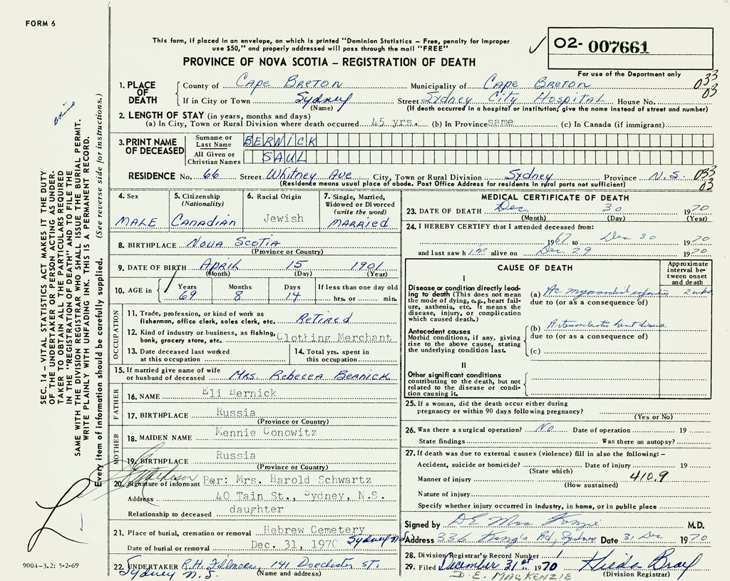 1. PLACE OF DEATH County of Cape Breton If in City or Town Sydney