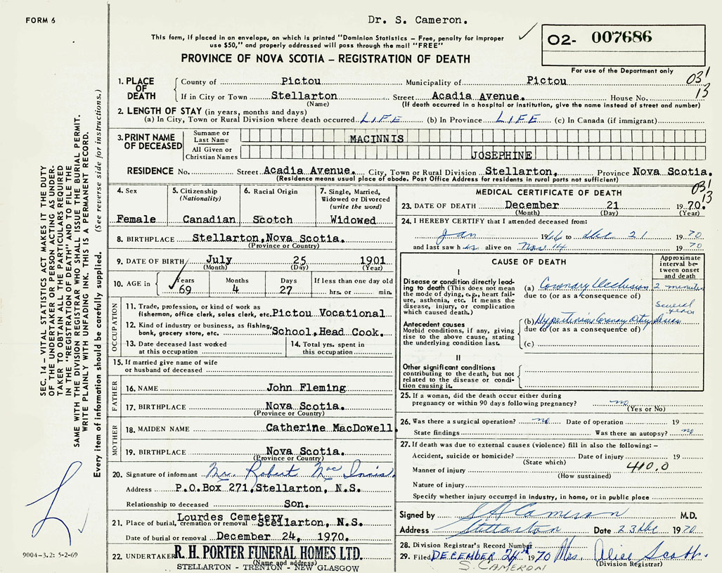 1. PLACE OF DEATH County of Pictou If in City or Town Stellarton