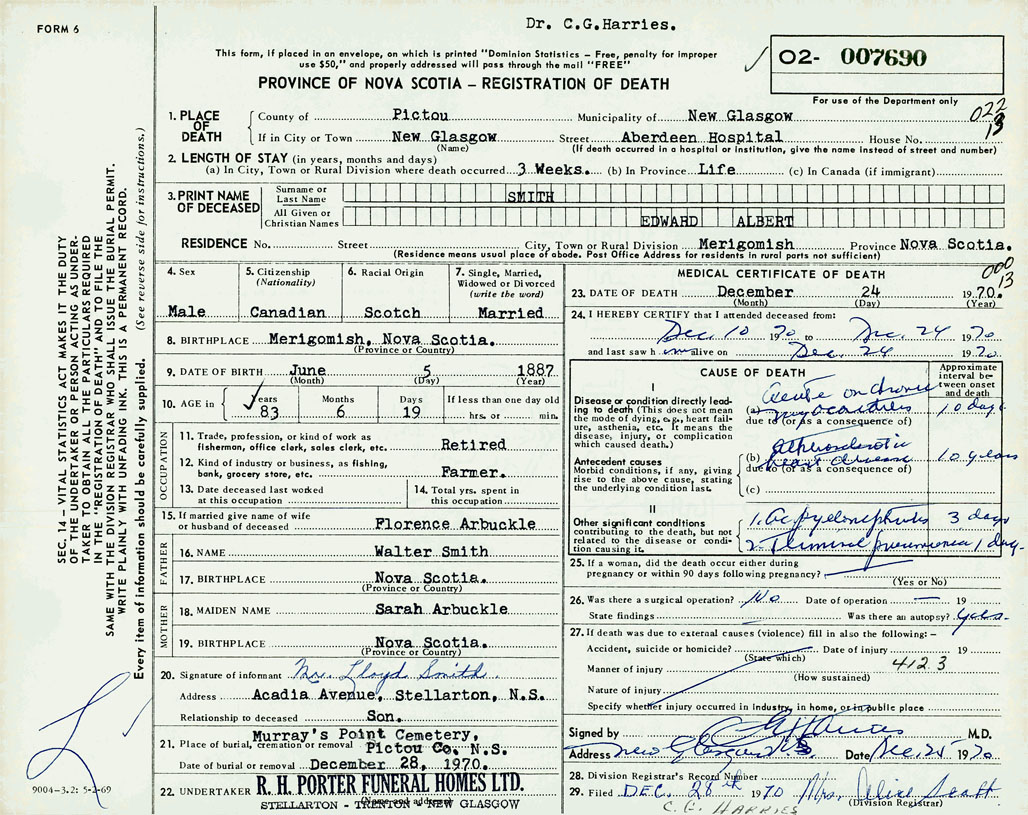 PROVINCE OF NOVA SCOTIA — REGISTRATION OF DEATH