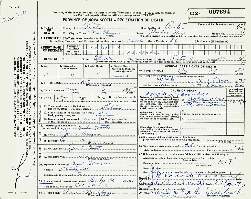 PROVINCE OF NOVA SCOTIA — REGISTRATION OF DEATH