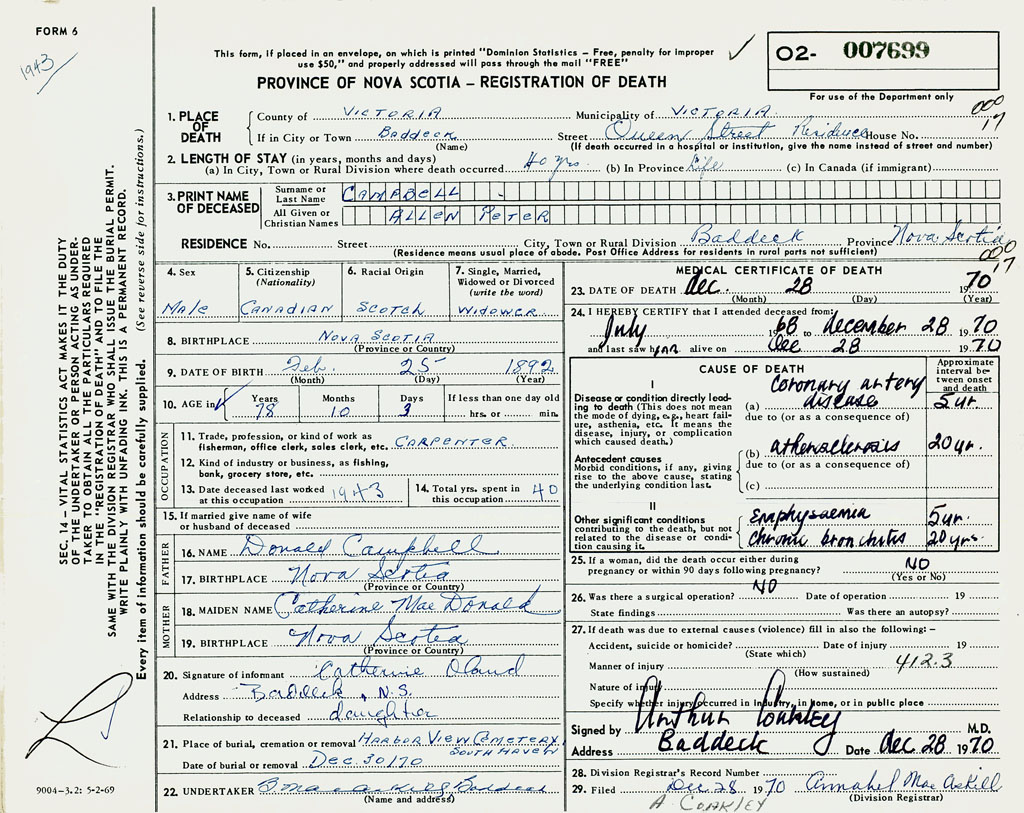 1. PLACE OF DEATH County of Victoria If in City or Town Baddeck