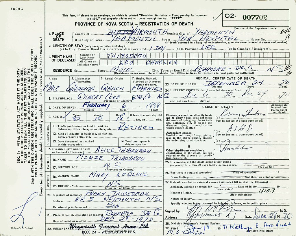 3. PRINT NAME OF DECEASED Thibodeau, Leo Charles