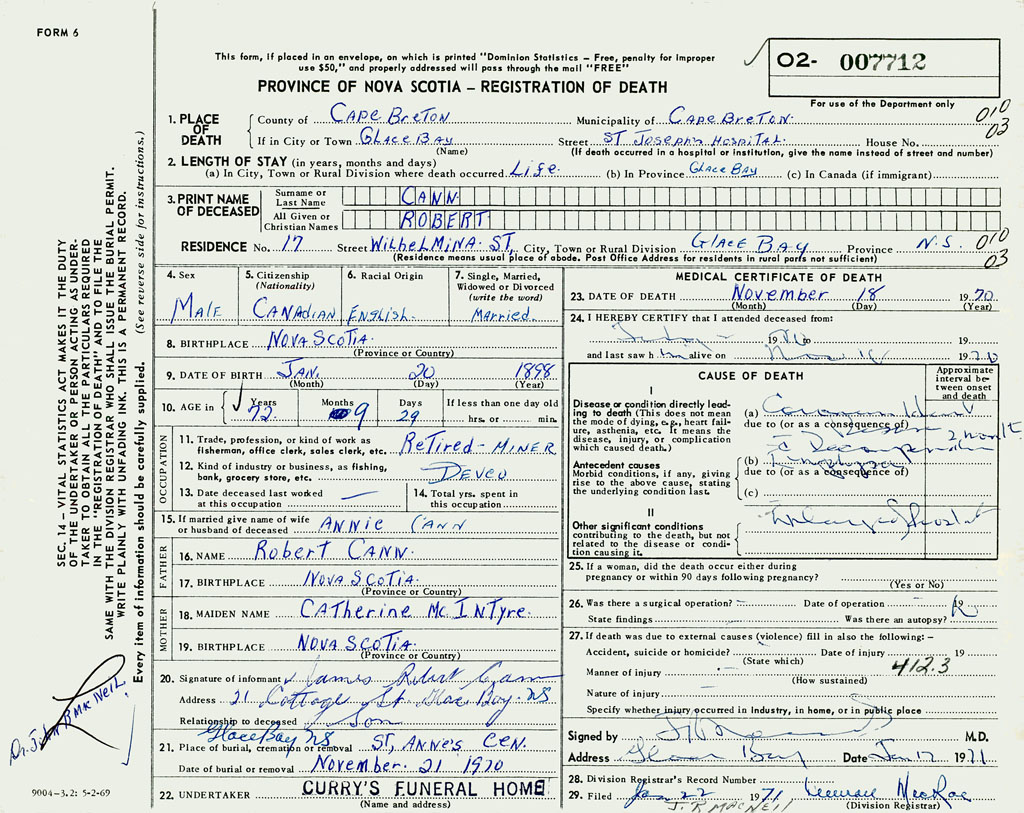 1. PLACE OF DEATH County of Cape Breton If in City or Town Glace Bay
