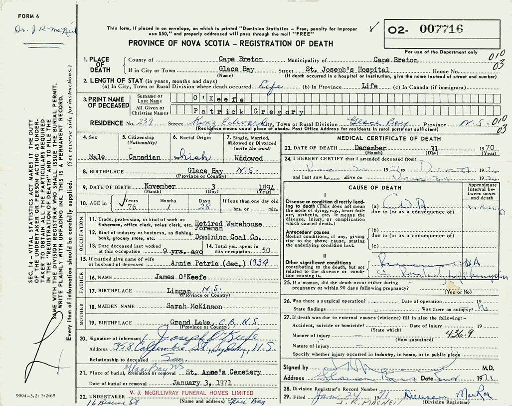 1. PLACE OF DEATH County of Cape Breton If in City or Town Glace Bay