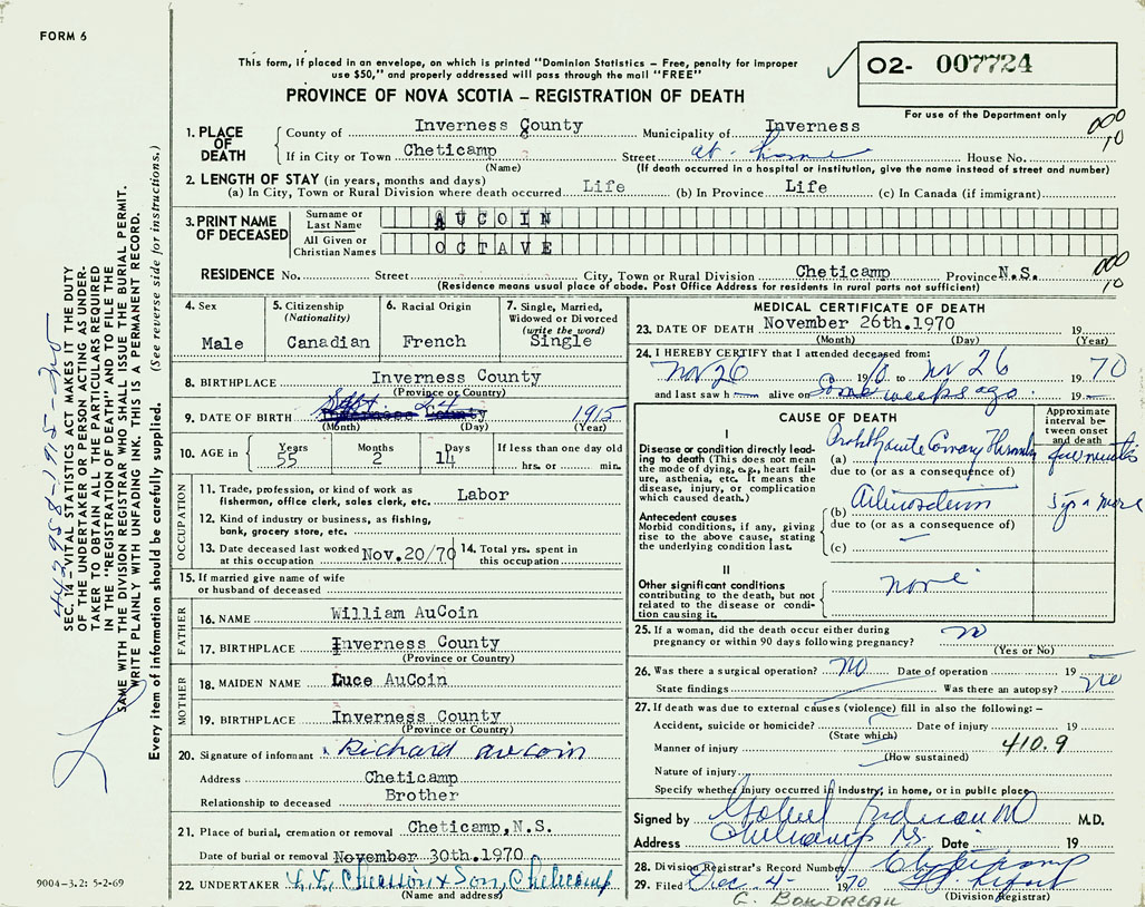 1. PLACE OF DEATH County of Inverness If in City or Town Cheticamp
