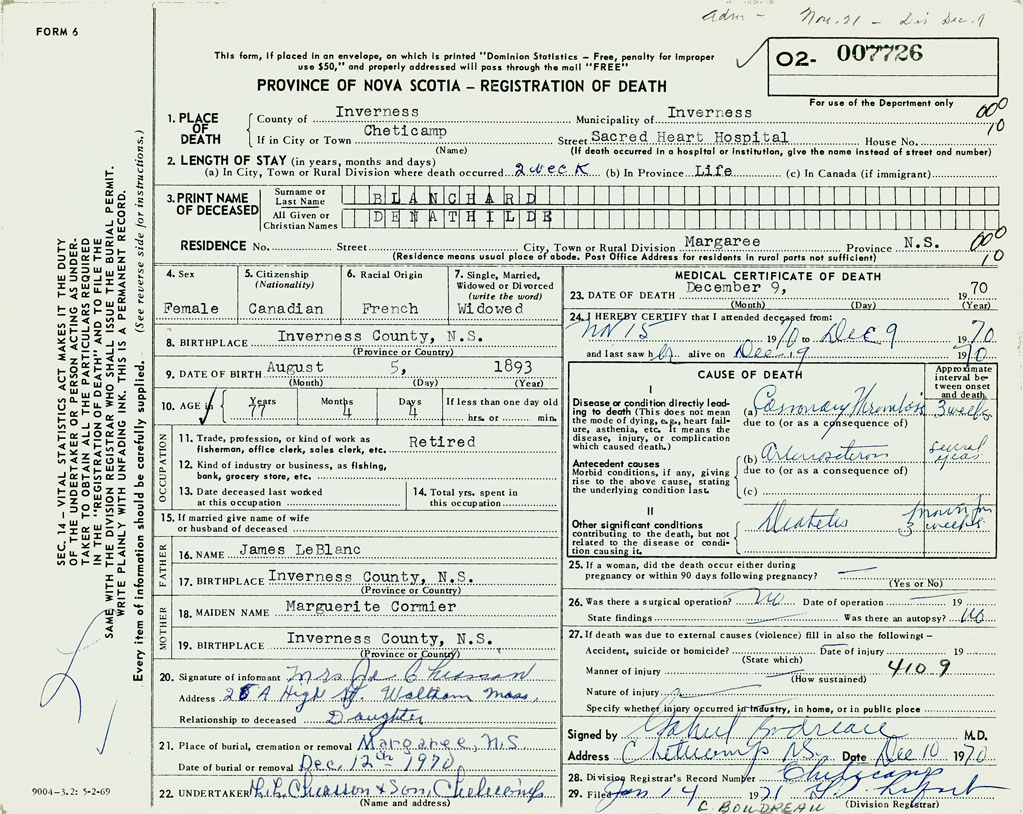 1. PLACE OF DEATH County of Inverness If in City or Town Cheticamp