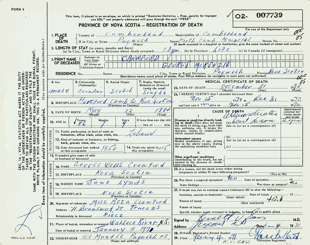 1. PLACE OF DEATH County of Cumberland If in City or Town Pugwash