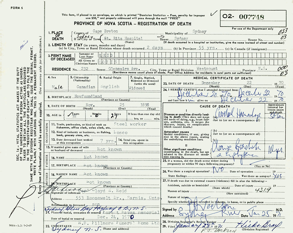 1. PLACE OF DEATH County of Cape Breton If in City or Town Sydney