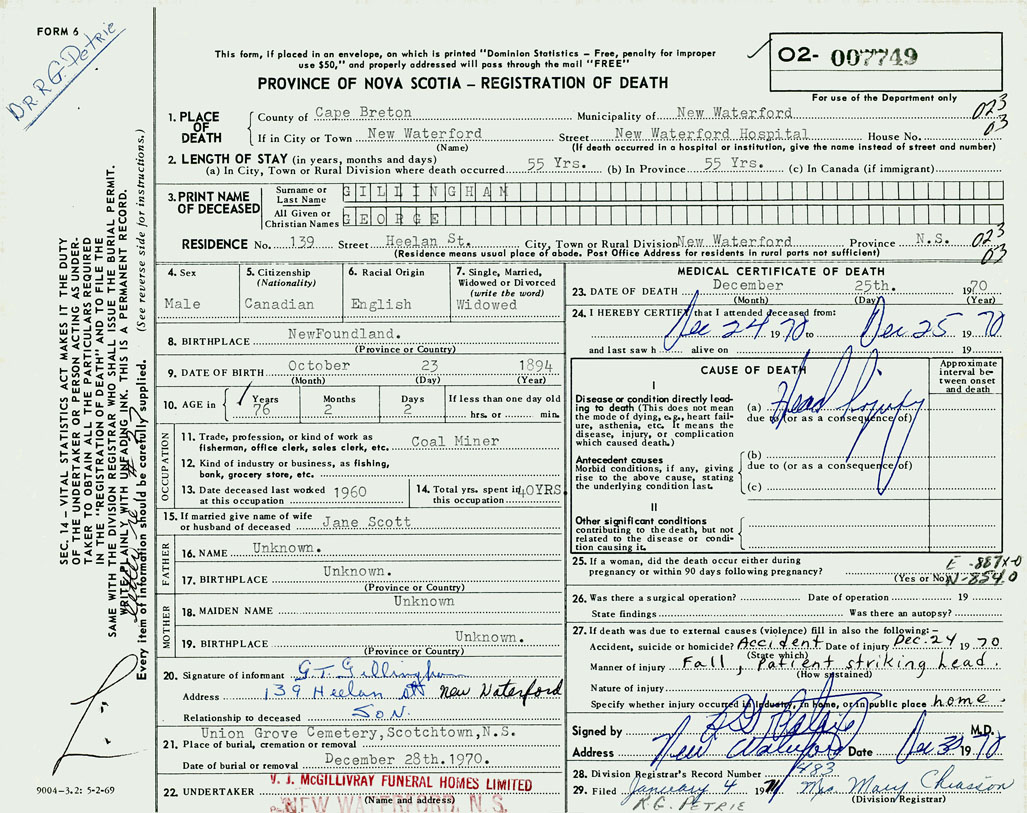1. PLACE OF DEATH County of Cape If in City or Town New Waterford