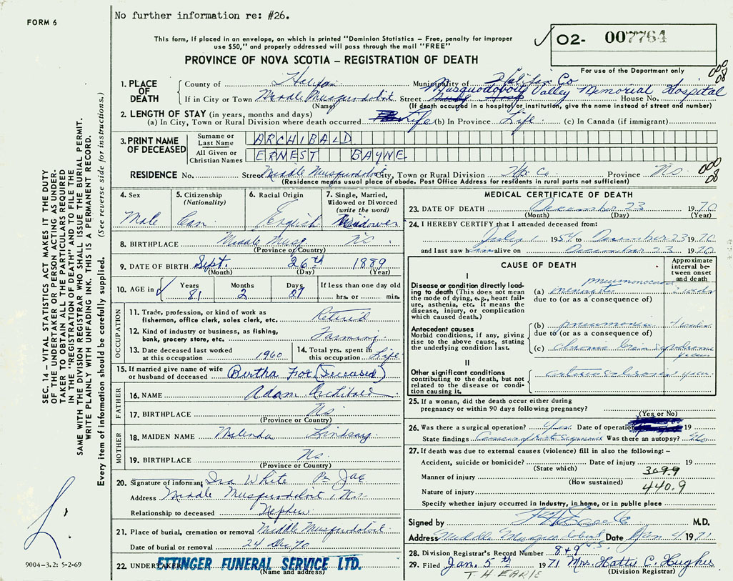 PROVINCE OF NOVA SCOTIA — REGISTRATION OF DEATH