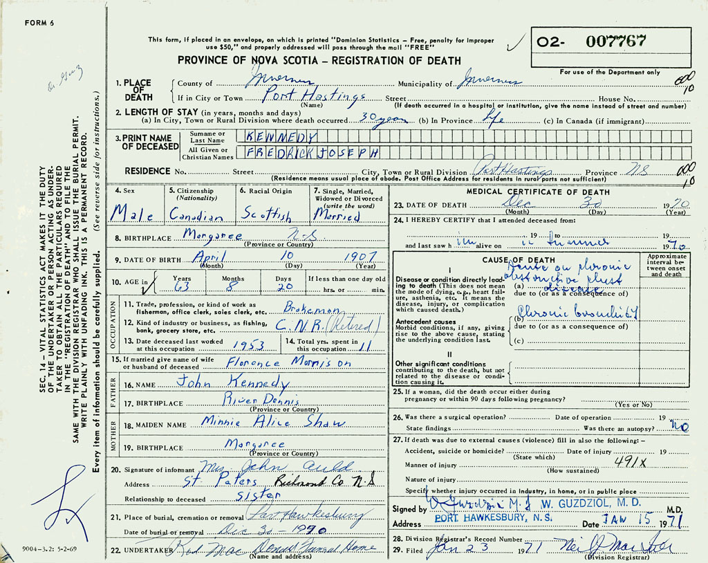 PROVINCE OF NOVA SCOTIA — REGISTRATION OF DEATH