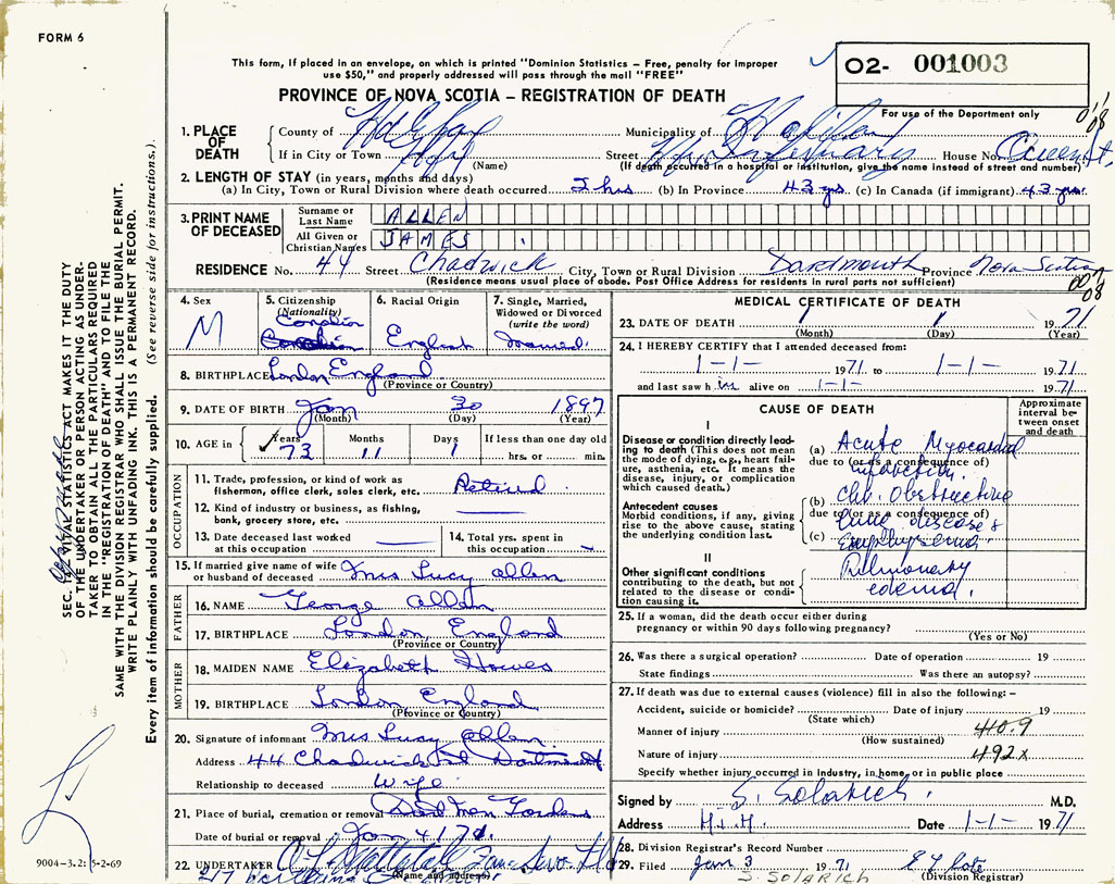 PROVINCE OF NOVA SCOTIA — REGISTRATION OF DEATH