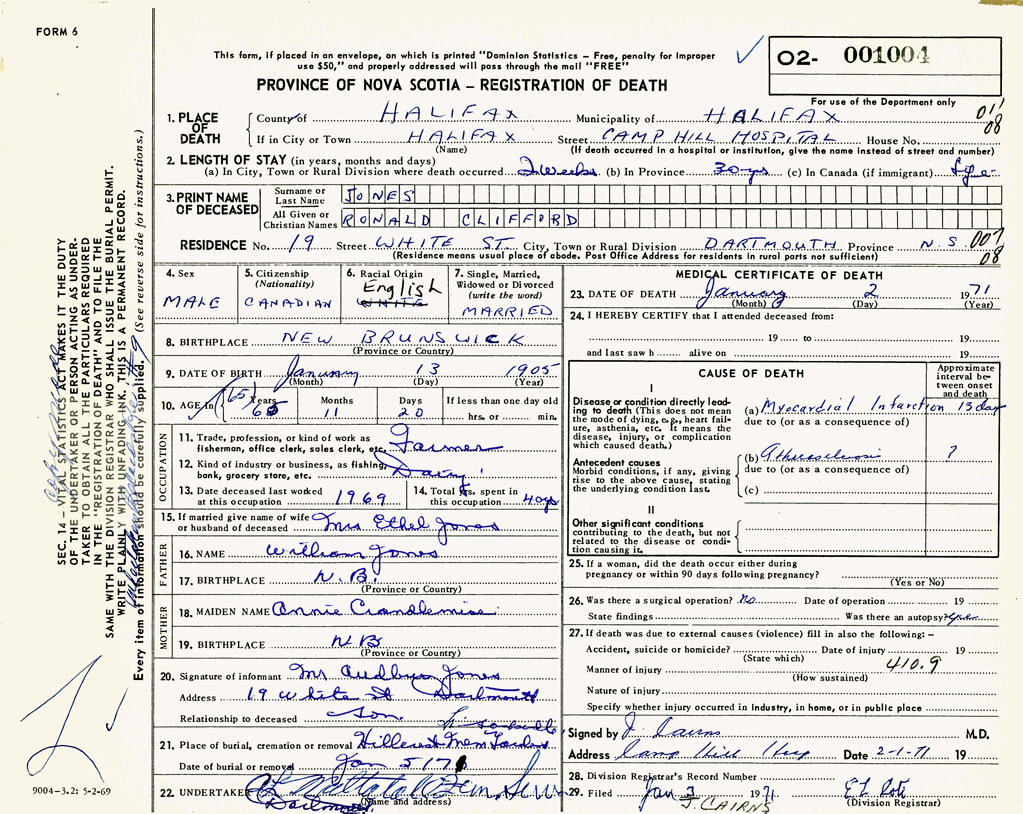 PROVINCE OF NOVA SCOTIA — REGISTRATION OF DEATH