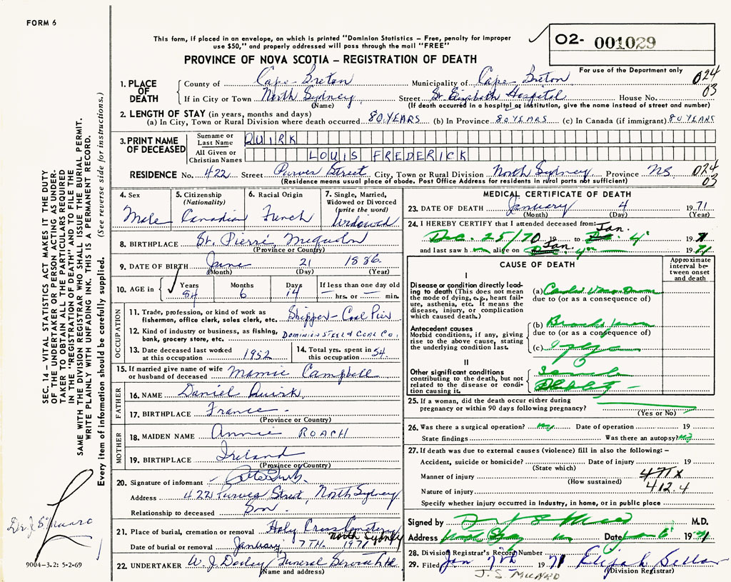 1. PLACE OF DEATH County of Cape Breton If in City or Town North Sydney