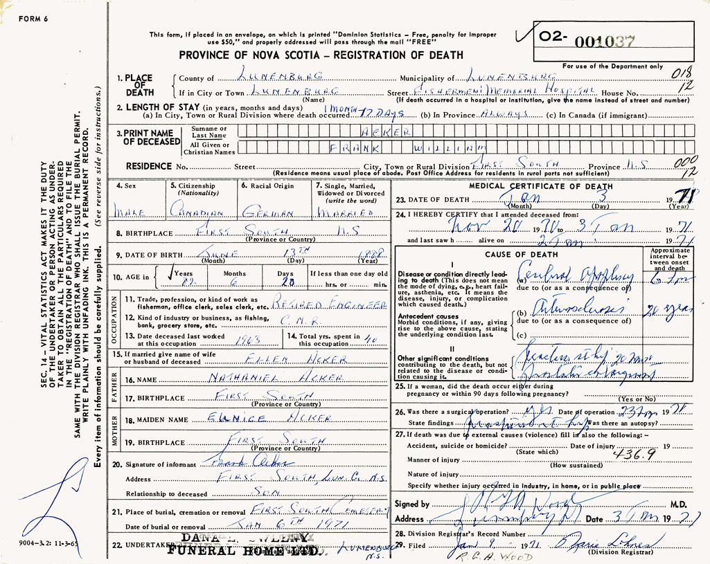 PROVINCE OF NOVA SCOTIA — REGISTRATION OF DEATH
