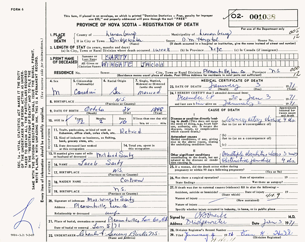 PROVINCE OF NOVA SCOTIA — REGISTRATION OF DEATH