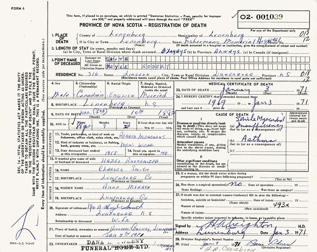 PROVINCE OF NOVA SCOTIA — REGISTRATION OF DEATH