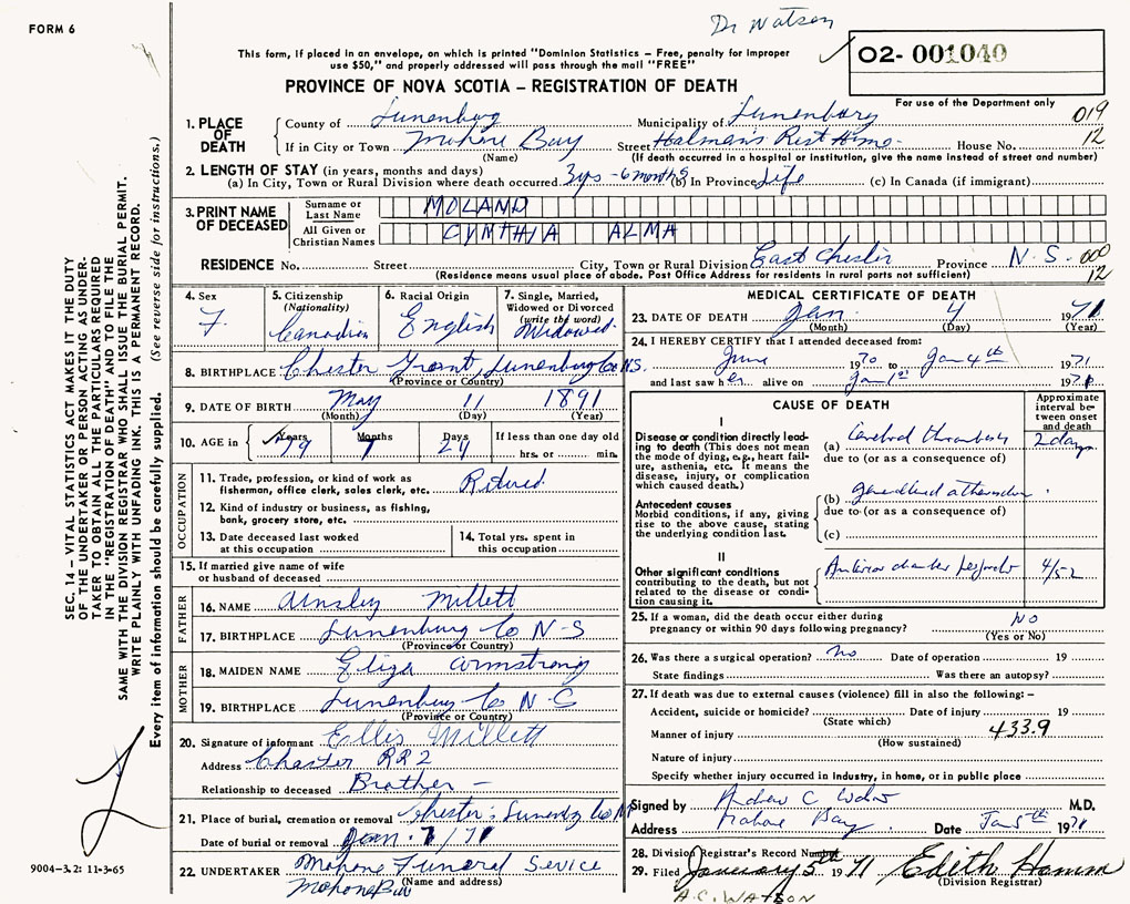 1. PLACE OF DEATH County of Lunenburg If in City or Town Mahone Bay