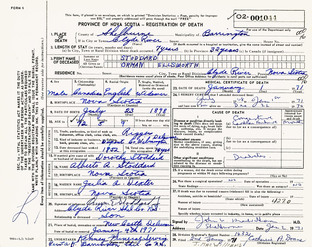 PROVINCE OF NOVA SCOTIA — REGISTRATION OF DEATH
