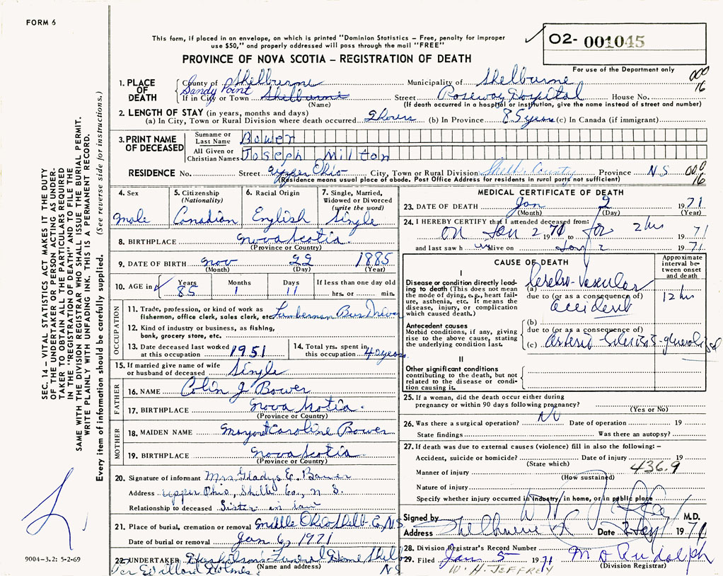 1. PLACE OF DEATH County of Shelburne If in City or Town Sandy Point