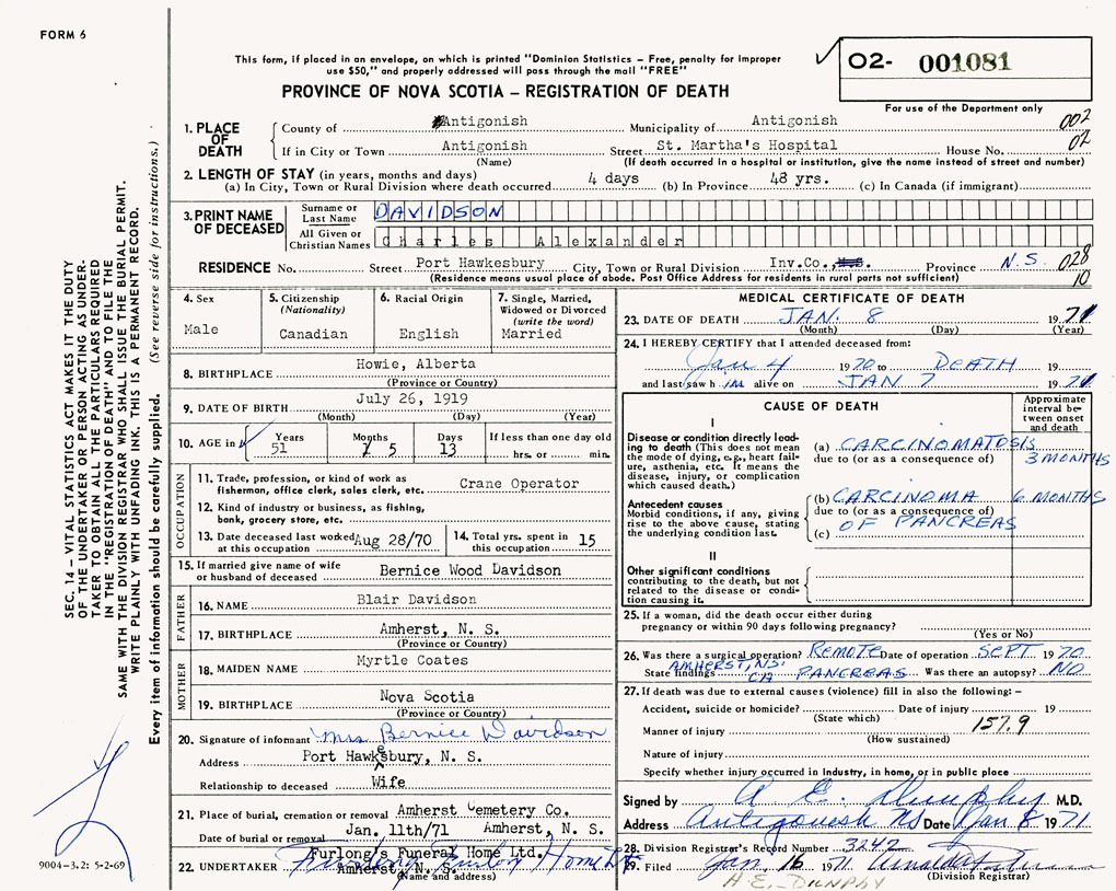 PROVINCE OF NOVA SCOTIA — REGISTRATION OF DEATH