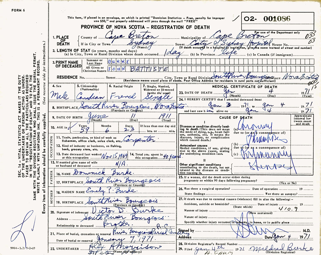 1. PLACE OF DEATH County of Cape Breton If in City or Town Sydney