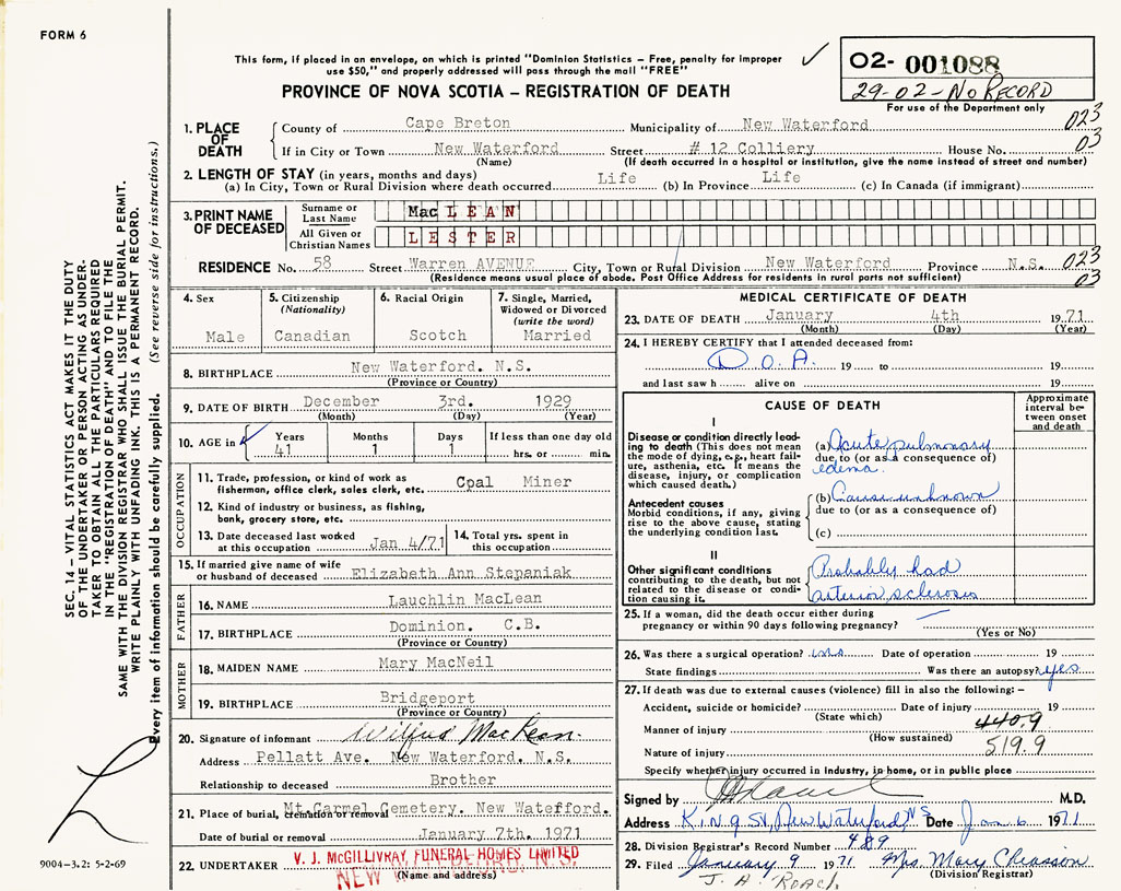 1. PLACE OF DEATH County of Cape Breton If in City or Town New Waterford