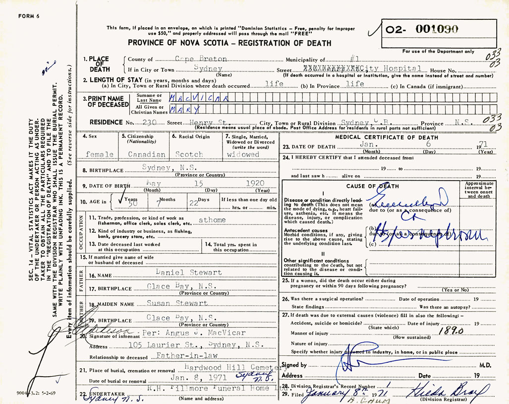 1. PLACE OF DEATH County of Cape Breton If in City or Town Sydney