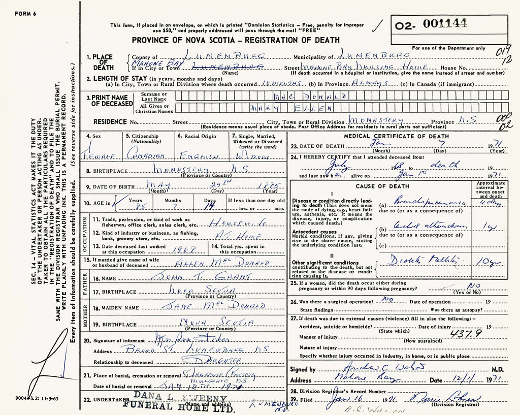 1. PLACE OF DEATH County of Lunenburg If in City or Town Mahone Bay