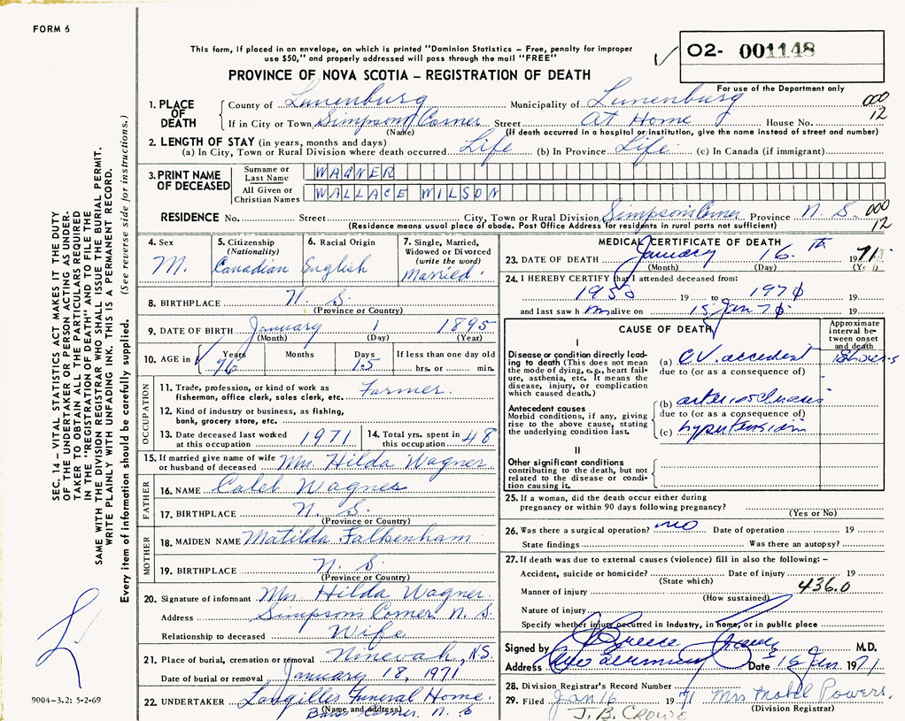 PROVINCE OF NOVA SCOTIA — REGISTRATION OF DEATH