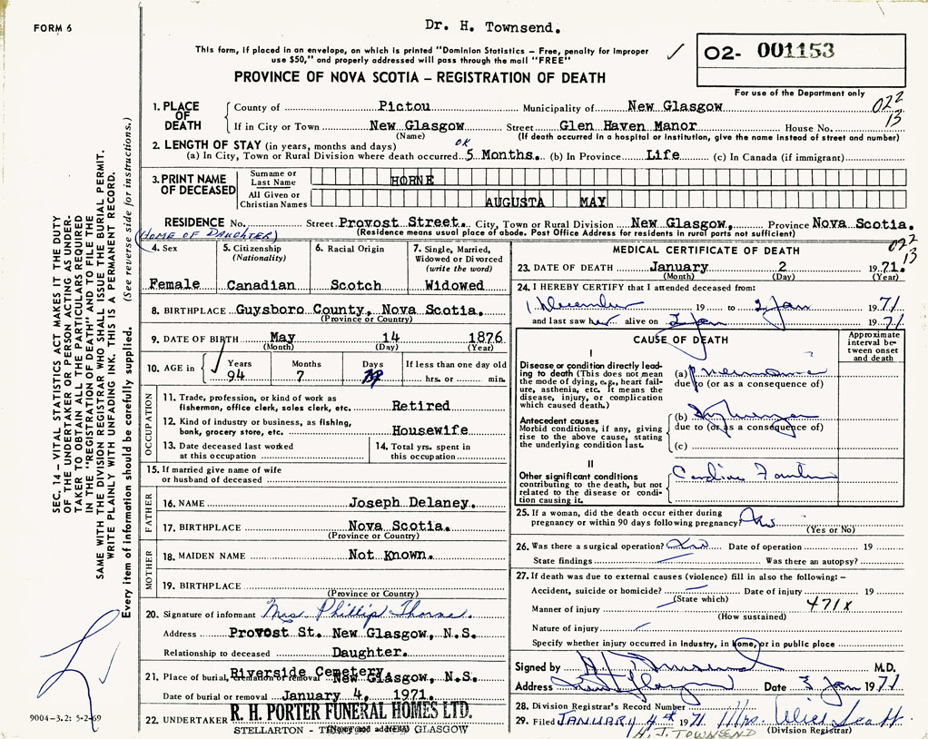 PROVINCE OF NOVA SCOTIA — REGISTRATION OF DEATH