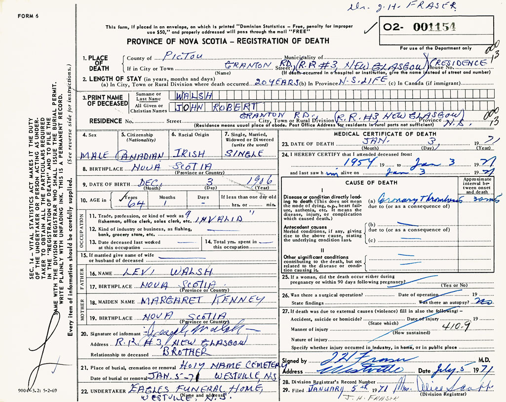 PROVINCE OF NOVA SCOTIA — REGISTRATION OF DEATH