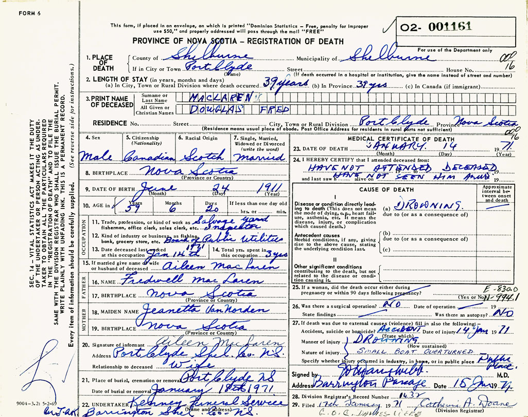 PROVINCE OF NOVA SCOTIA — REGISTRATION OF DEATH
