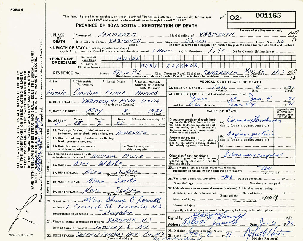 PROVINCE OF NOVA SCOTIA — REGISTRATION OF DEATH