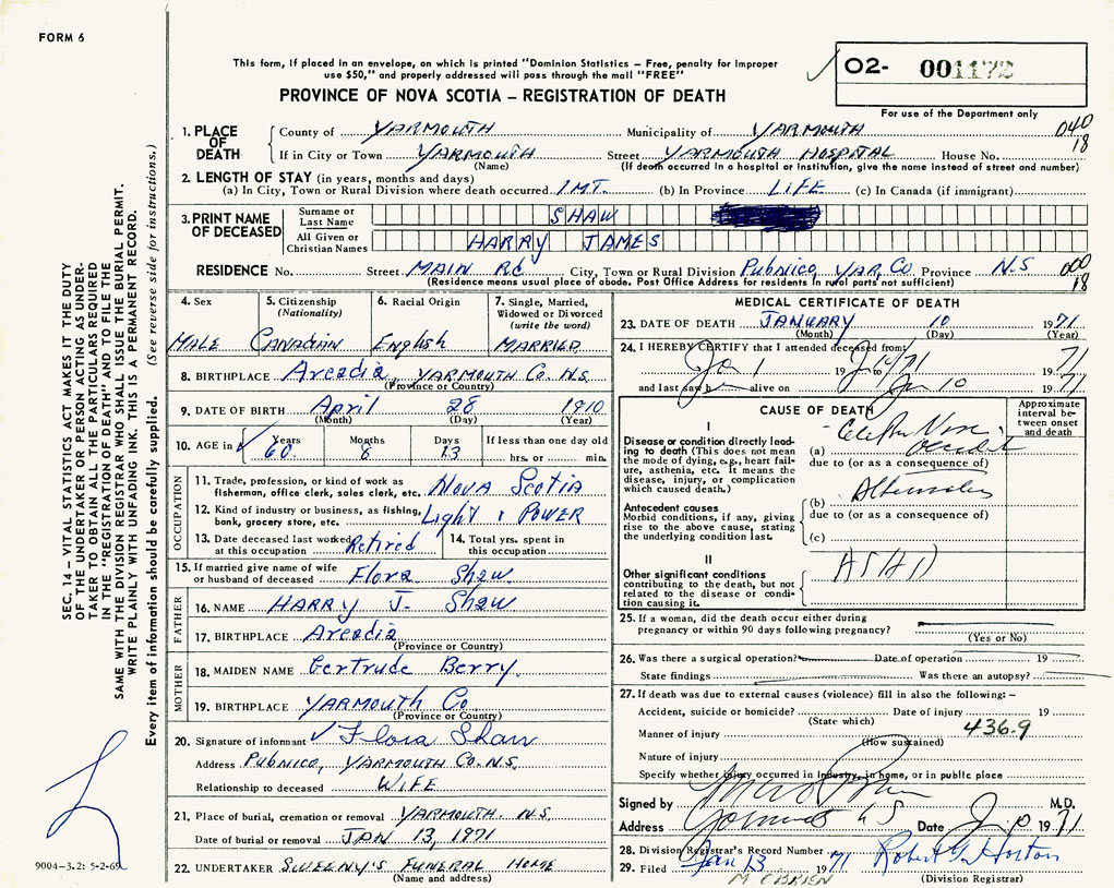 PROVINCE OF NOVA SCOTIA — REGISTRATION OF DEATH