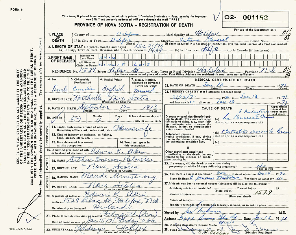 PROVINCE OF NOVA SCOTIA — REGISTRATION OF DEATH