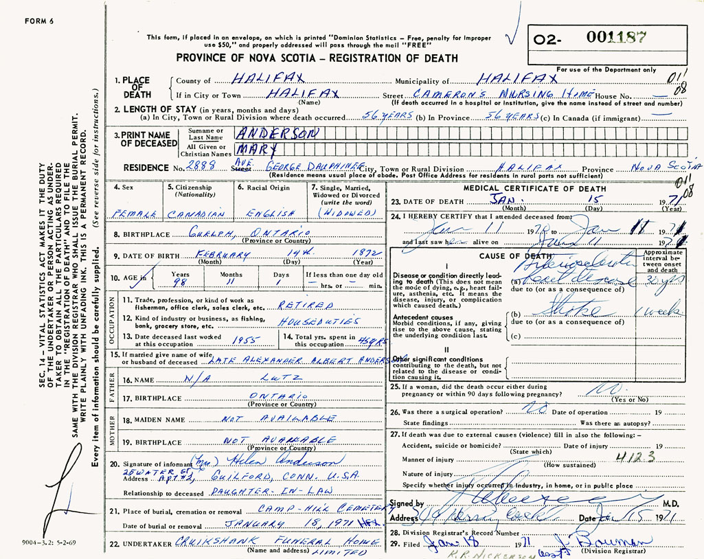 PROVINCE OF NOVA SCOTIA — REGISTRATION OF DEATH