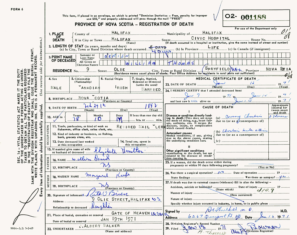 PROVINCE OF NOVA SCOTIA — REGISTRATION OF DEATH