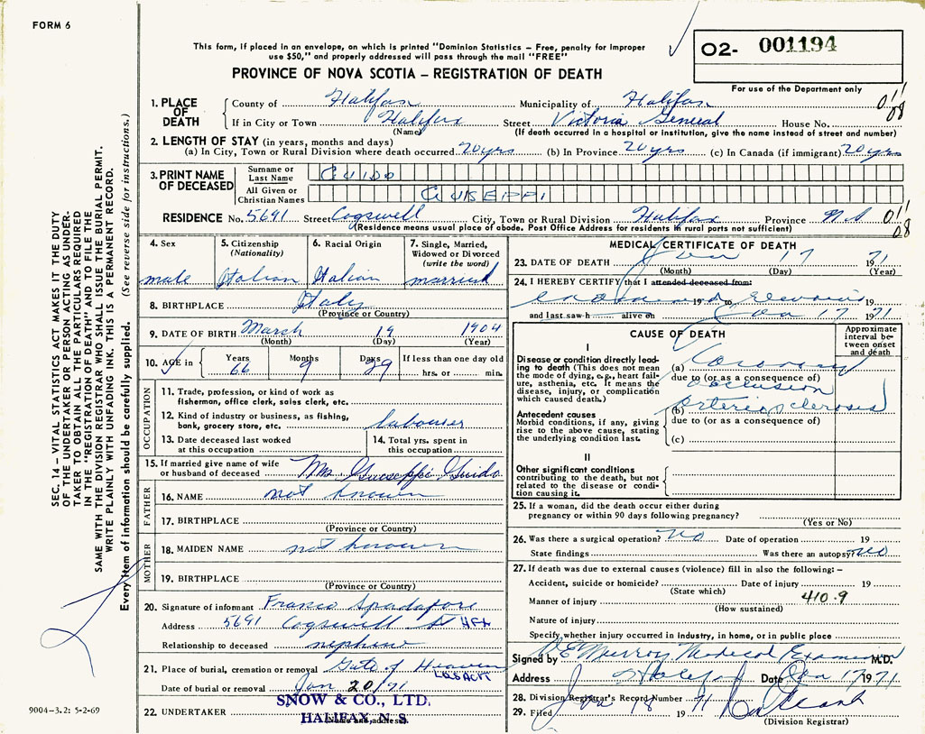 PROVINCE OF NOVA SCOTIA — REGISTRATION OF DEATH