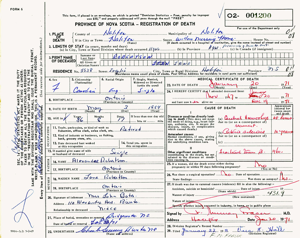 PROVINCE OF NOVA SCOTIA — REGISTRATION OF DEATH