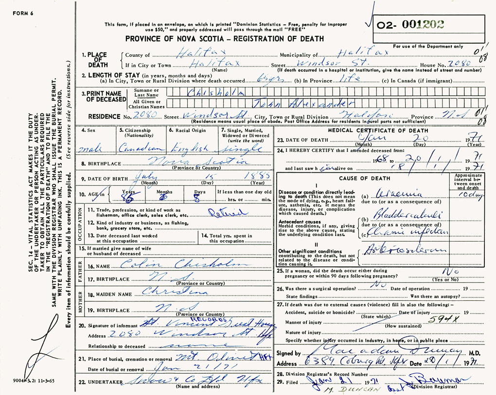 PROVINCE OF NOVA SCOTIA — REGISTRATION OF DEATH