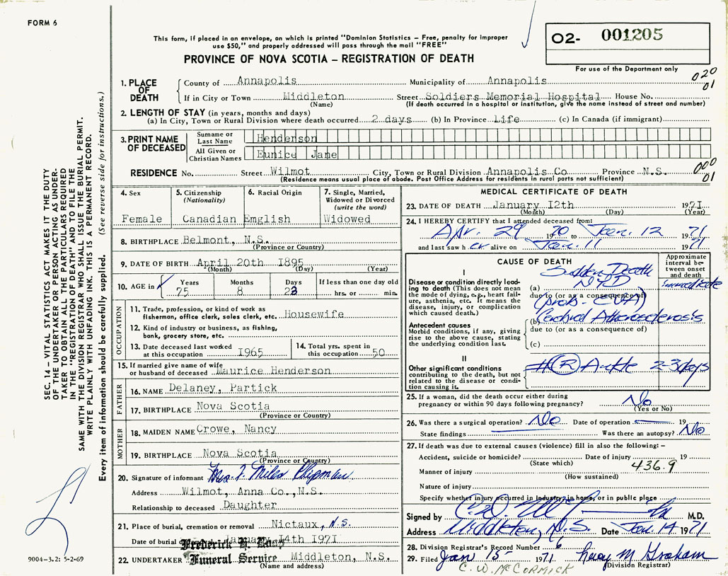 PROVINCE OF NOVA SCOTIA — REGISTRATION OF DEATH